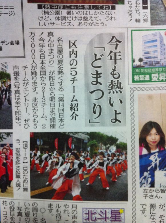 出演チームも、アクティブ大曽根さん、北誠の風さん、酔3さん、いろはさん、御田咲楽さんに来て頂けました。 総勢120名の踊り子さんの迫力は、かなりのものでしたo(^▽^)o 踊り子さんに関しては、初のホストチームとして頑張ったものの、後からどんどん手際の悪さに気がついて、「あーすればよかった」、 「こーすべきだった」と思いだします 。 観客の方々も想像以上にいっぱい来てて、 自分達の出番、どまつりパフォーマンスが始まる頃にはお客さんがギッシリ ! その人数に圧倒されながらも総踊り6曲踊ってきました。 とは言え、自分は裏方で音出しのタイミングを音響さんに教えてましたが、柿パラぐらいから我慢出来ず、踊ってしまいました。 めっちゃ楽しかったです ! このお祭り来年、再来年と続くといいな。 というより、昔の矢田川花火みたいな、でっかいイベントにしたいですね。 とりあえず、来年やるならもっとパワーアップした頂をお見せできると思います。 皆さん、本当にありがとうございましたo(^▽^)o |