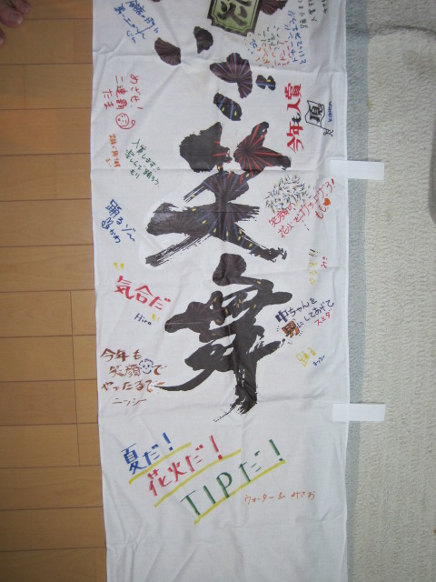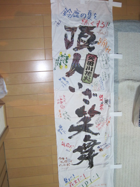 で、日曜の練習時にすずフェス用ののぼりを皆で寄せ書きしました。